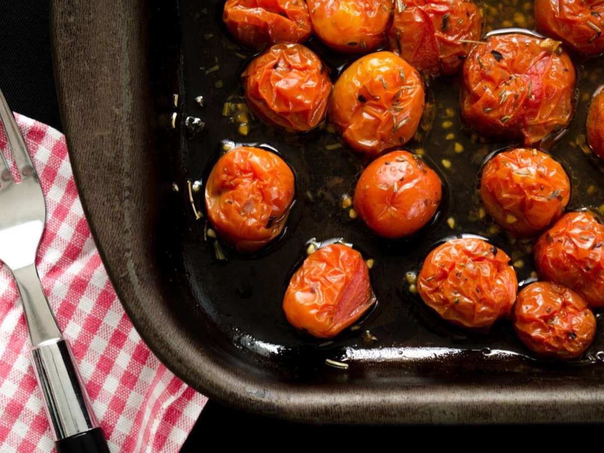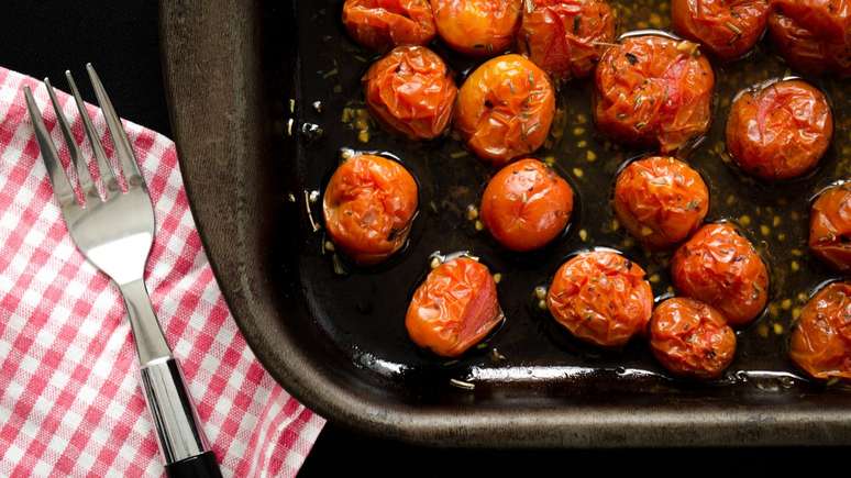 - Leve ao forno pré-aquecido a 180°C por 20 min, mexa os tomates delicadamente, deixe por mais 15 min ou até ficarem murchos e dourados.