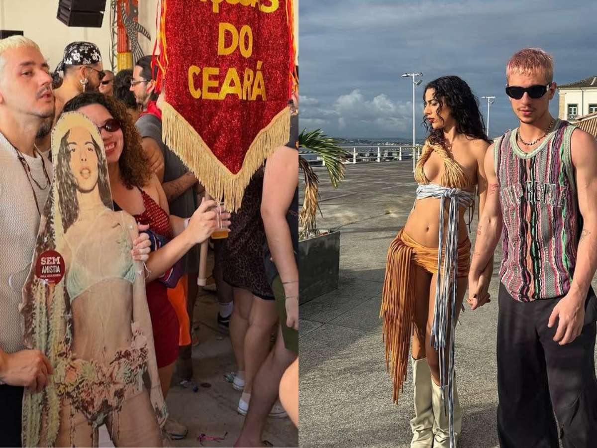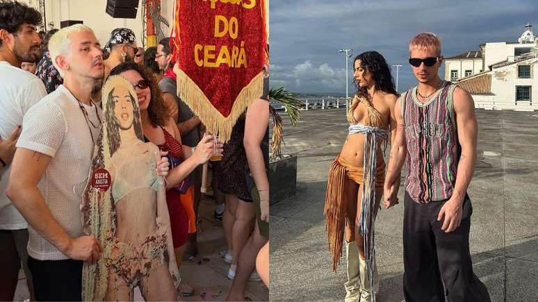 Foi aí que entrou a engenharia do Carnaval. Sem a presença física da cantora, o folião confeccionou um totem de papelão com uma foto de Marina Sena, criando a ilusão perfeita (e cômica) do casal curtindo a folia.