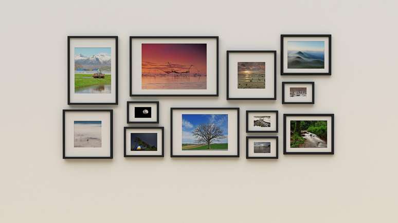 Nichos: nesse caso, você posiciona os quadros de forma a criar pequenos nichos. Por exemplo: em uma área superior da parede, coloque apenas fotos de uma viagem feita em família; em outro espaço, inclua fotos da infância dos filhos, etc. Você pode criar quantos nichos achar necessários.