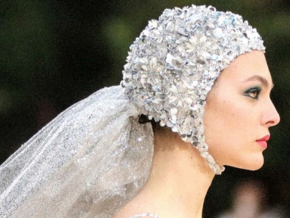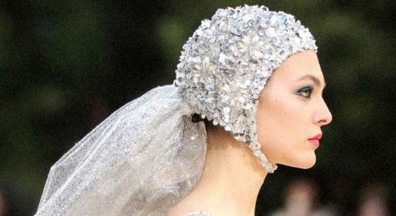 A modelo Vittoria Ceretti fechou o desfile da Chanel com look de noiva formado por maiô, touca e véu.