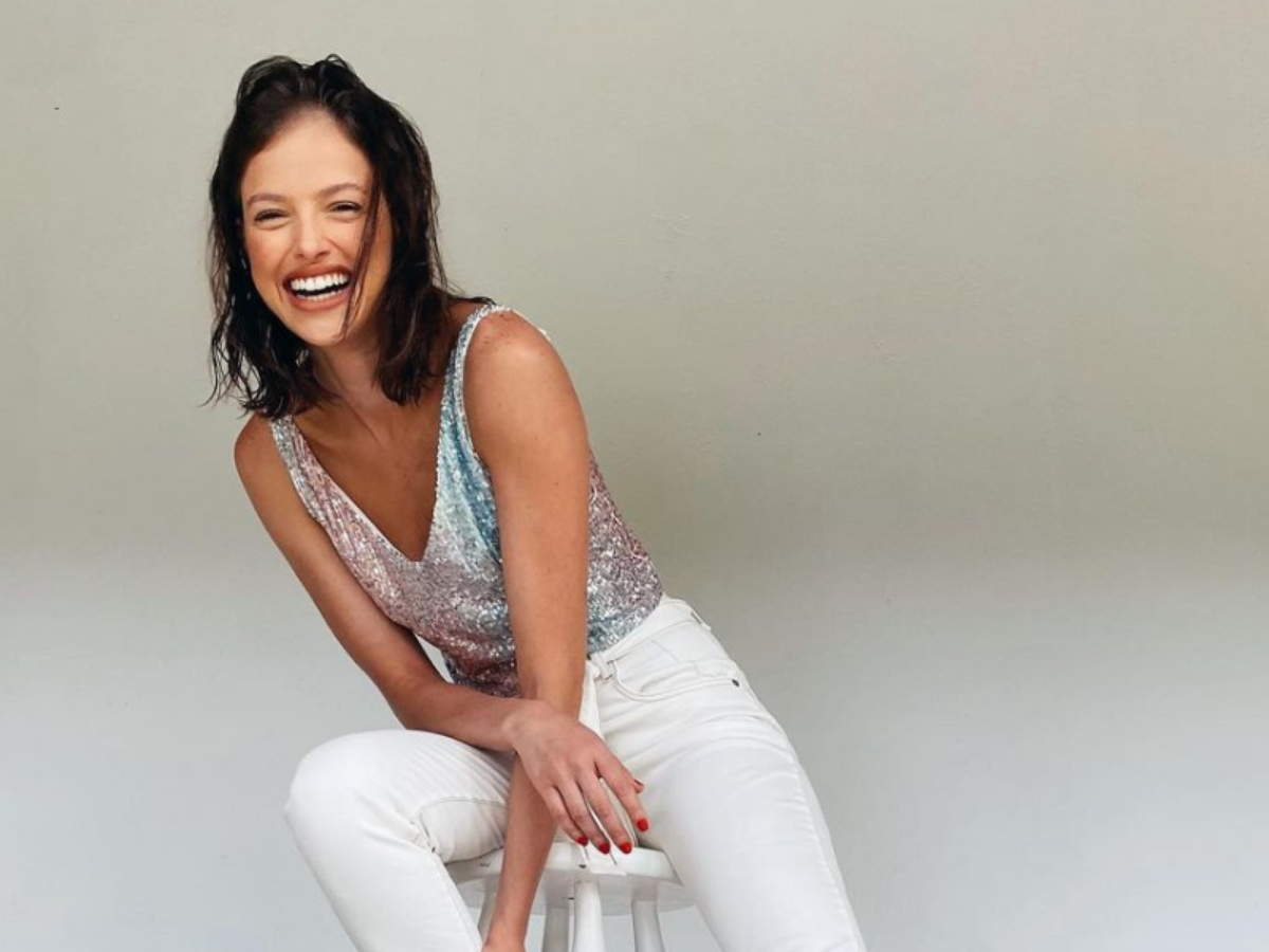 Nas fotos, a atriz veste peças da Riachuelo. Está com top cropped brilhante (R$ 79,90), de alças finas ajustáveis, decote V e forro interno. Completou a produção com calça clochard branca (R$ 119,90) e sandália de salto fino e tiras metalizadas (R$ 99,90).