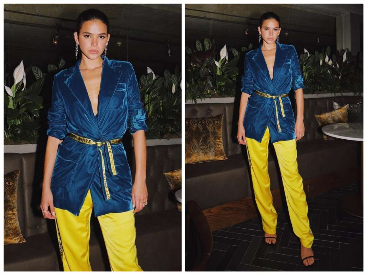 Bruna Marquezine combina azul e amarelo em look de R$ 17 mil