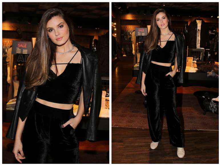 Camila compôs o visual preto com conjunto de veludo, que contrasta com o ar pesado da jaqueta de couro. O toque de sensualidade ficou por conta de parte da barriga à mostra e do decote. Arrematou a produção com tênis claro, que custa R$ 568. O calçado é confeccionado em algodão e tem cano médio, amarração em cadarço e estampa lateral com palavras em inglês.