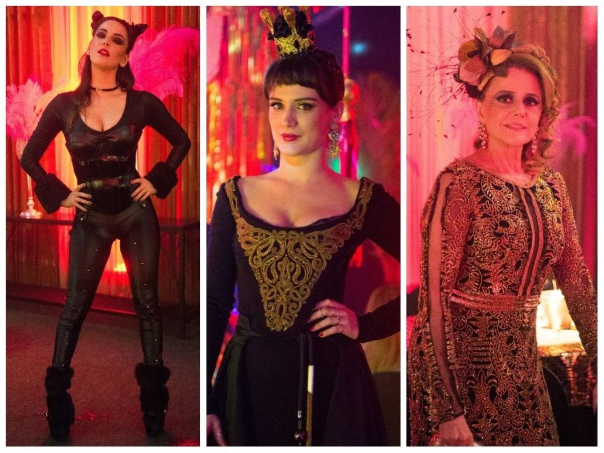 Melissa (Gabriella Mustafá) escolheu vestido floral com costas à mostra, além de enfeite de cabeça. Na foto com Odair (Felipe Titto), Ivanilda (Telma Souza) exibe vestido azul com outro transparente por cima. Angela Bismark, de vestido com recortes em tule e aplicações de renda em azul, faz uma participação na novela, compondo o júri do concurso de fantasias.