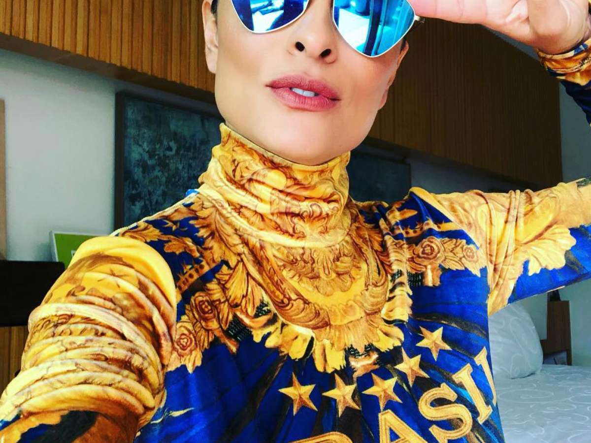 Juliana Paes combinou o body com óculos de sol azul. Os cabelos presos realçam as estampas e a modelagem do body.