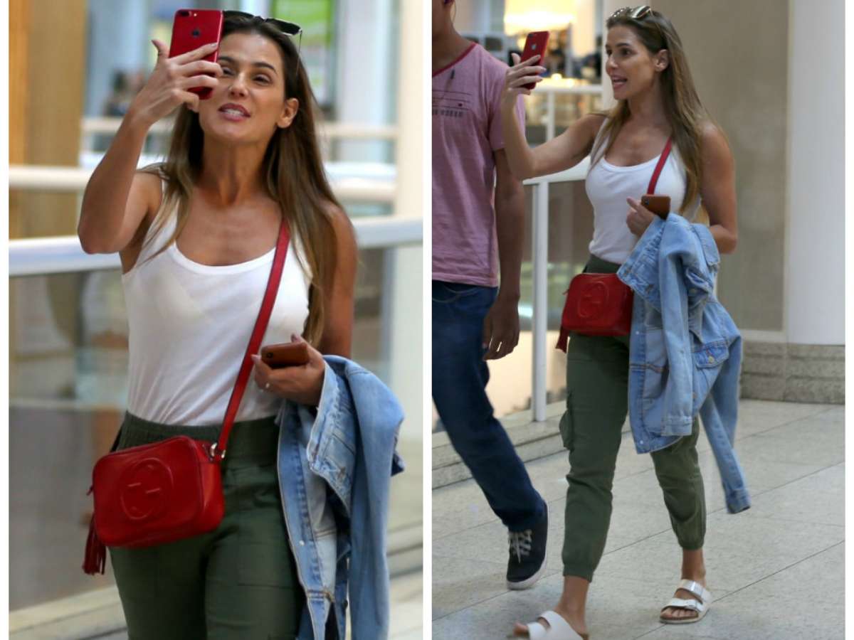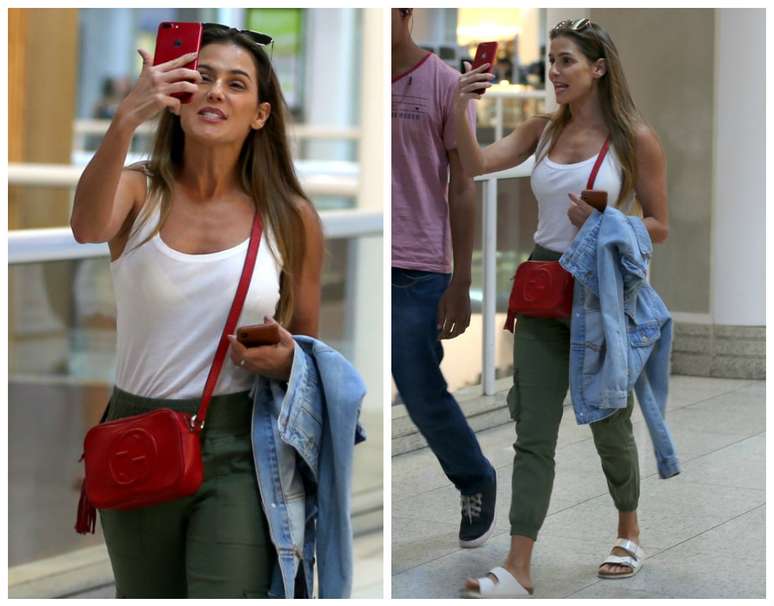 Camiseta regata branca, calça verde-militar, jaqueta jeans e sandália modelo Birkenstock. Para completar e quebrar os tons básicos do look, usou bolsa Gucci vermelha, que custa 1.190 dólares no site da marca. Na conversão pelo dólar desta terça-feira (13), o valor do acessório é de R$ 3.858.