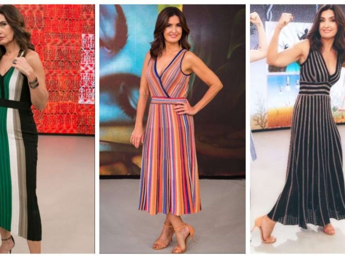 Entre os vários looks que ela usa, os vestidos listrados na vertical conferem o efeito alongador, que deixa a silhueta mais longilínea. Os modelos costumam trazer outros elementos que dão essa sensação de alongar. Confira três modelos usados pela apresentadora que ajudam a deixar a silhueta mais longilínea.