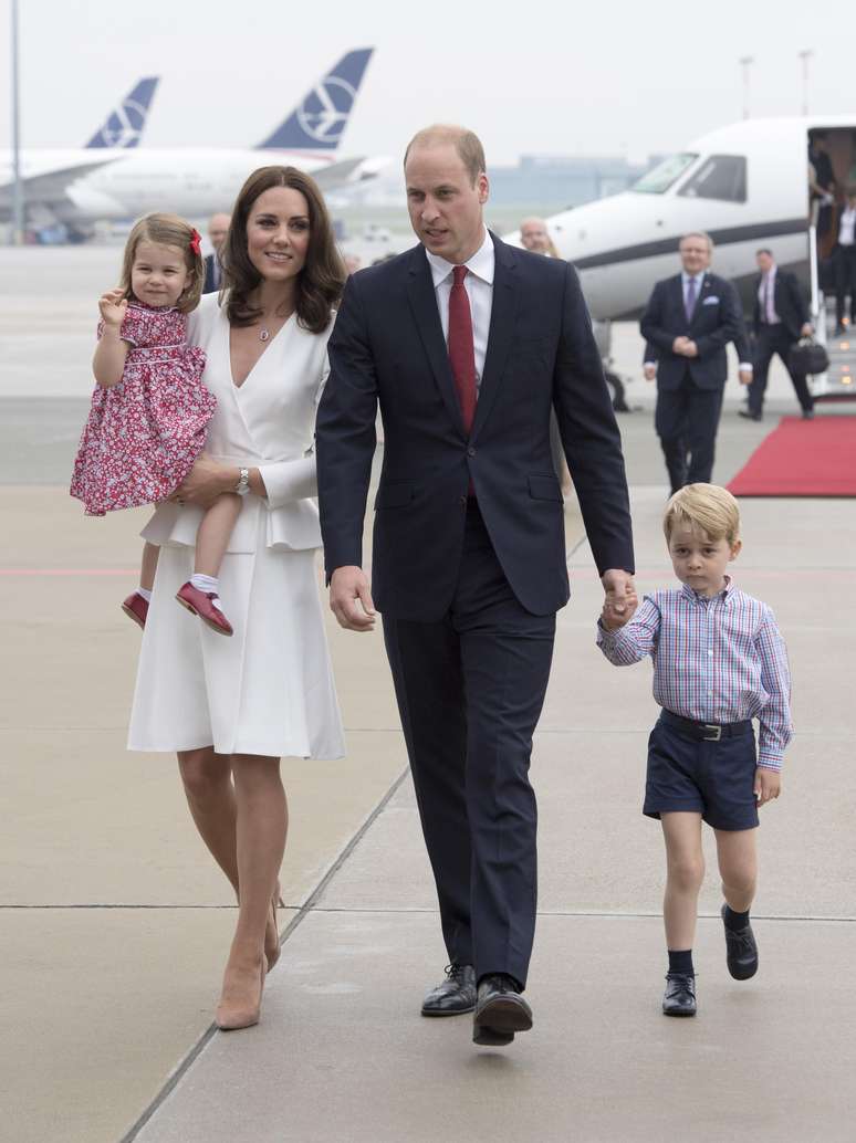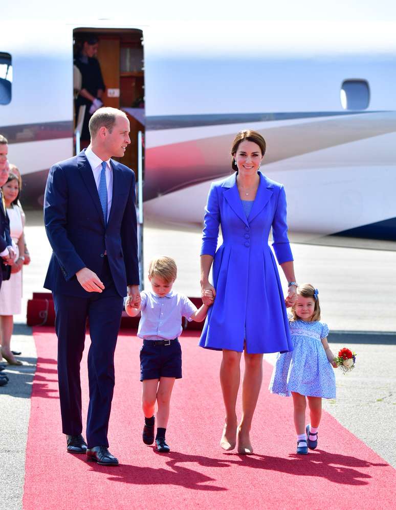 Após sair da Polônia, Kate e a família real foram para a Alemanha. Mais um look monocromático superelegante foi usado pela Duquesa de Cambridge. O casaco azul da grife inglesa Catherine Walker & Co é chique, elegante e, apesar de ser uma cor fria, combina perfeitamente com a pele de Kate, que combinou com clutch também azul Jimmy Choo e, mais uma vez, o sapato nude de Gianvito Rossi.