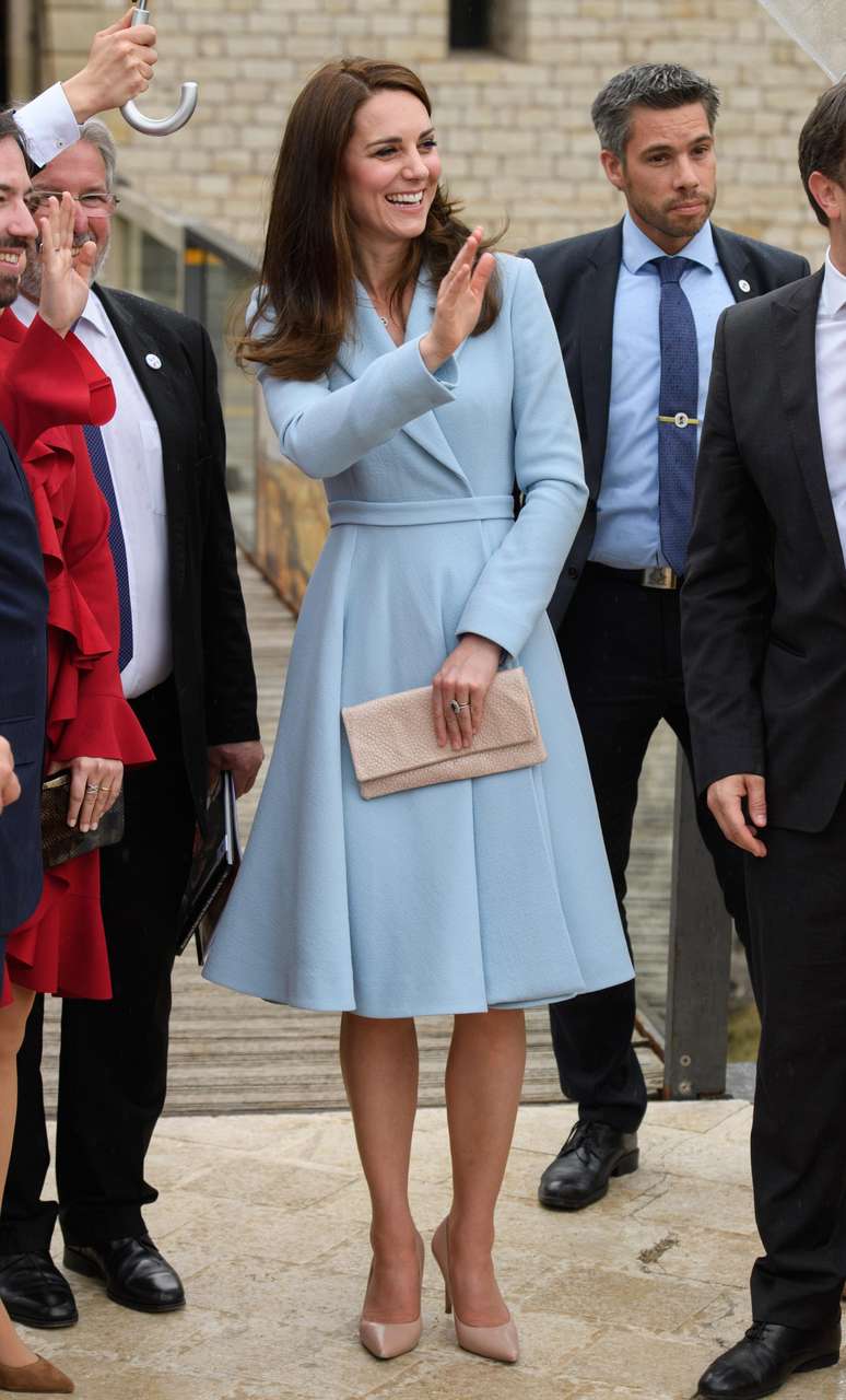 Em visita a Luxemburgo, em maio, mais uma vez apostou em look azul, mas levemente mais claro. Com as lapelas cruzadas e pregas na saia, o vestido de mangas longas traduz a elegância discreta e sem firulas de Kate Middleton. Outra vez com escarpim nude, cor também da clutch. Agora, é esperar para ver se a princesa melhora logo da hiperêmese gravídica, para nos inspirar com seus looks de grávida.