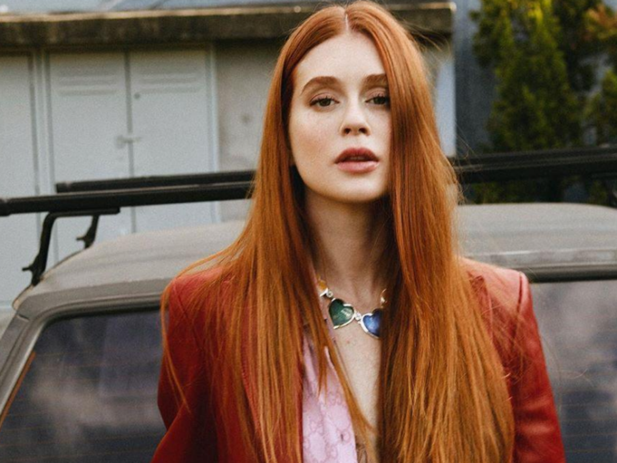 Marina Ruy Barbosa postou esta foto em seu instagram. O conjunto todo é da Gucci. Veja como a cor em tom de telha combina com os cabelos ruivos da atriz. Ela combinou com camisa rosa e colar com pingente der coração em tons de verde, contrapondo com as cores do look. A modelagem alongada é boa pedida para alongar a silhueta.