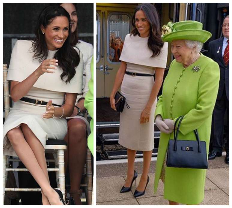 Ambas visitaram o condado de Cheshire , no norte da Inglaterra. A rainha vestiu seu look monocromático de sempre, dessa vez na cor verde-limão. E Meghan apostou no vestido marfim, feito sob medida para ela pela grife francesa.