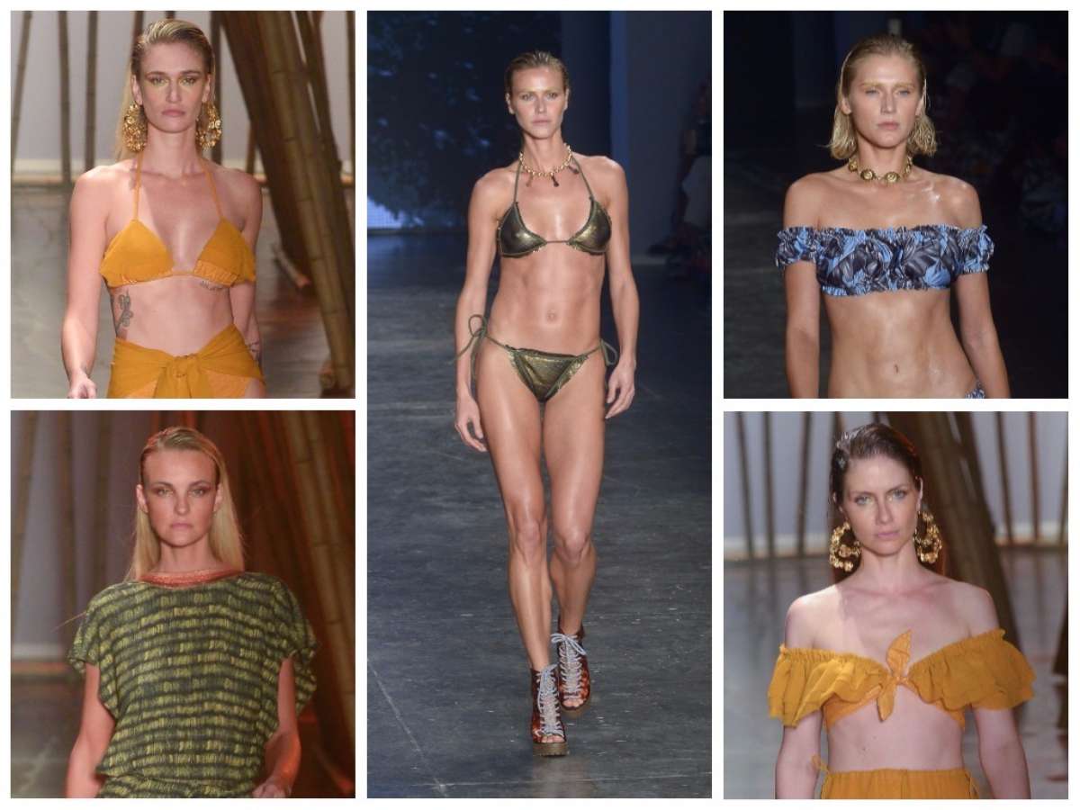 Celina Locks subiu na passarela com peças da Água de Coco (duas fotos à esquerda), TIG (centro), Triya (duas à direita) e Lenny Niemeyer.