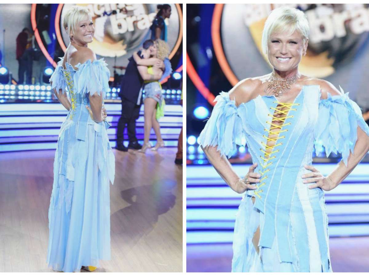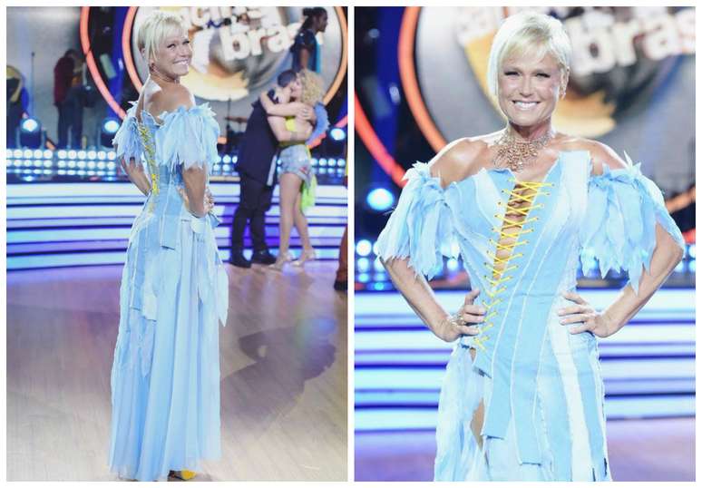 A apresentadora Xuxa estreou a terceira temporada de "Dancing Brasil" nesta quarta-feira (17), às 22h30. Foi a melhor estreia do programa, com com 8 pontos de média e 9 de pico na Grande São Paulo e com a tag #DancingBrasil liderando os Trending Topics do Twitter . Ao contrário dos looks com brilho, paetês e cristais, a loira escolheu um vestido feito com tiras de jeans cortadas a laser.