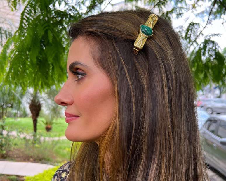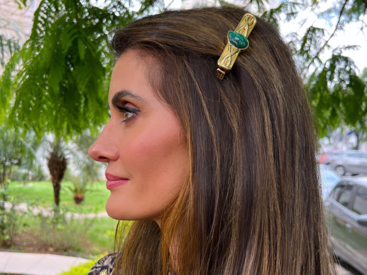 A consultora de moda apostou num vestido longo com estampa floral. O look de Isabella Fiorentino revisita o estilo dark flower. O fundo escuro é em azul-marinho e deixa as flores em vermelho e branco em evidência, recheando bem toda a superfície do longo, com leve franzido na cintura. O modelo, da grife Tory Burch, deixa a silhueta bem verticalizada e alongada. No cabelo, apostou nos fios soltos presos com fivela na lateral.