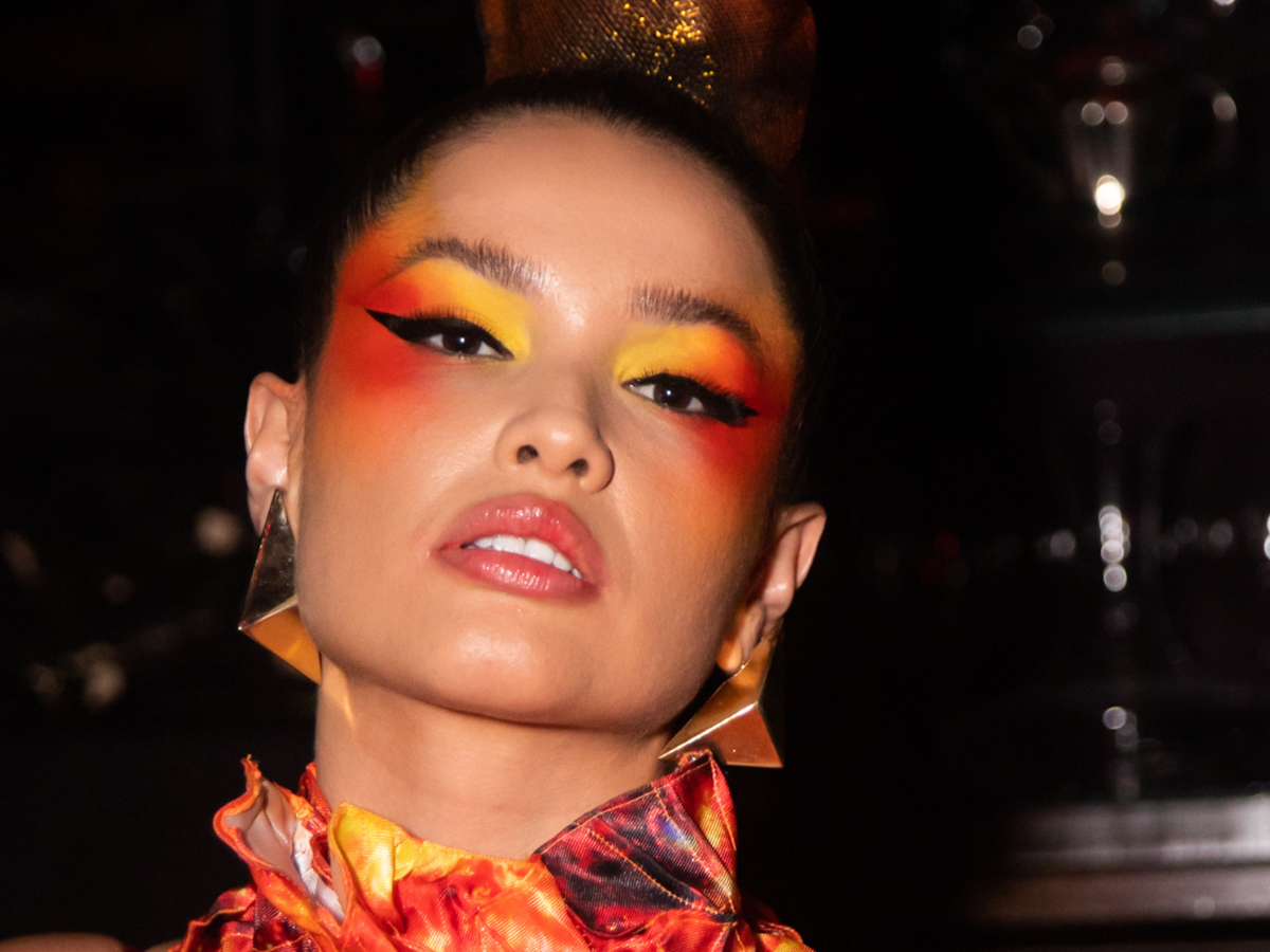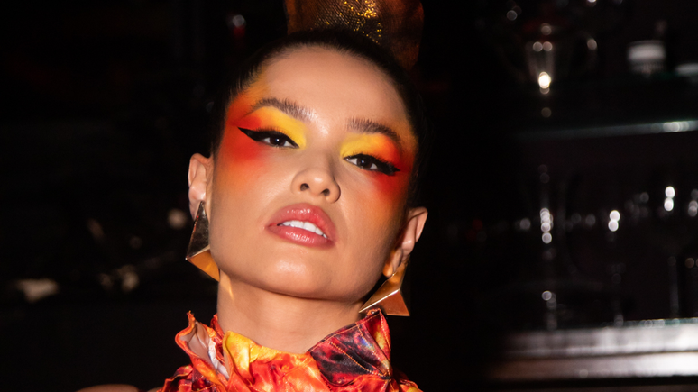 Os complementos são brincos Rose Benedetti e sandália René Caovilla, com styling de Lucas Boccalão. A beleza, assinada por Helder Rodrigues, destacou os olhos com efeito degradê em amarelo, laranja e vermelho.