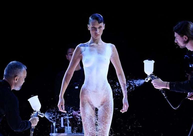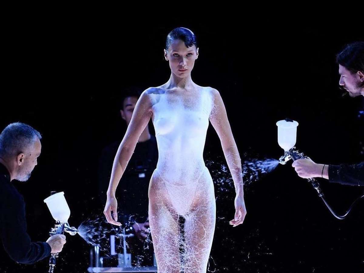 A Coperni supreendeu na semana de moda de Paris ao criar na própria passarela um vestido claro e justo para a modelo Bella Hadid, que entrou só de calcinha e com as mãos cobrindo os seios. Com jatos que lembravam tinta, aos poucos o vestido foi se materializando. Um verdadeiro show de tecnologia, futurismo e moda.
