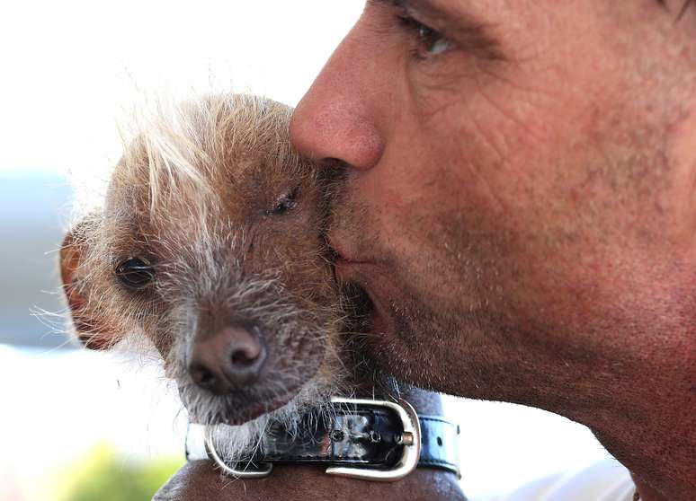 Heather Payette beija Boolah, uma mistura de cão de crista chinês com terrier, durante o 25º Concurso Anual de Cachorro Mais Feio na feira de Sonoma Marin