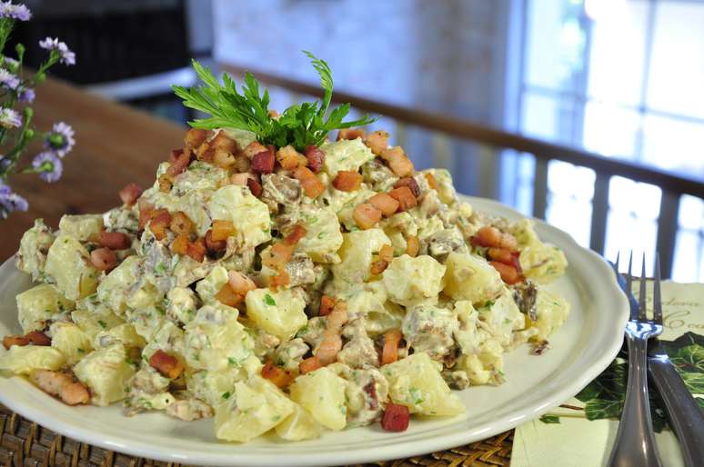 Dica: O segredo para sair aquela batata perfeita numa maionese e cortar ela antes de cozinhar e depois vigiar bem para não passar do ponto. Se tentar cortar depois ela se quebra toda e não fica uma apresentação tão bonita.
