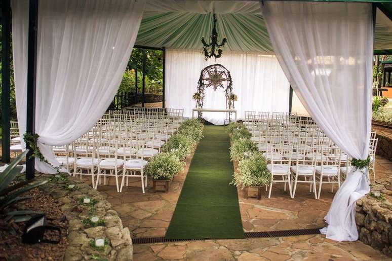 O verde e as flores são muito convidativos para a estação, mas é importante usar os elementos com cautela para não exagerar. Escolha tons claros como rosa, amarelo, branco e azulado. Sofás com tons florais deixarão o ambiente mais leve. O tapete que leva os noivos ao altar pode ser substituído por rosas vermelhas. Na recepção, aposte em mesas coloridas, serviço de pratos típicos da região do casamento e mobílias rústicas.