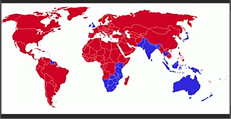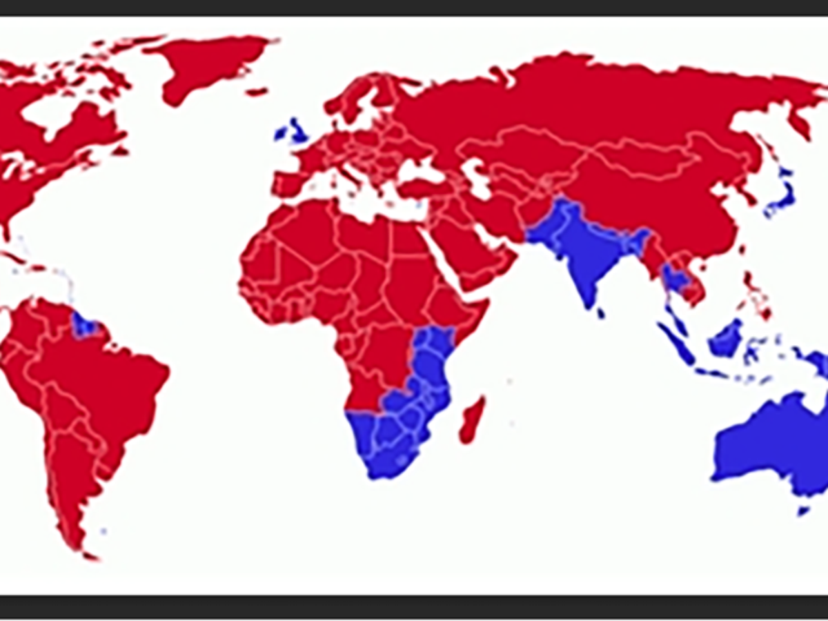 O mundo tem dois sistemas de trânsito. Lugares onde as pessoas dirigem os carros no lado esquerdo, com o veículo na pista da direita (em vermelho). E o contrário: volante à direita no carro, que trafega na pista à esquerda (em azul).