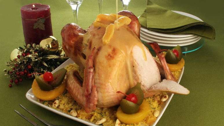 Na preparação, a ave é recheada com uma deliciosa farofa de bacon, vegetais e uvas passas, além de decorada com frutas em calda, incluindo os indispensáveis pêssego, figo e abacaxi. É uma receita de encher os olhos e dar água na boca! Por isso, confira o passo a passo completo a seguir: