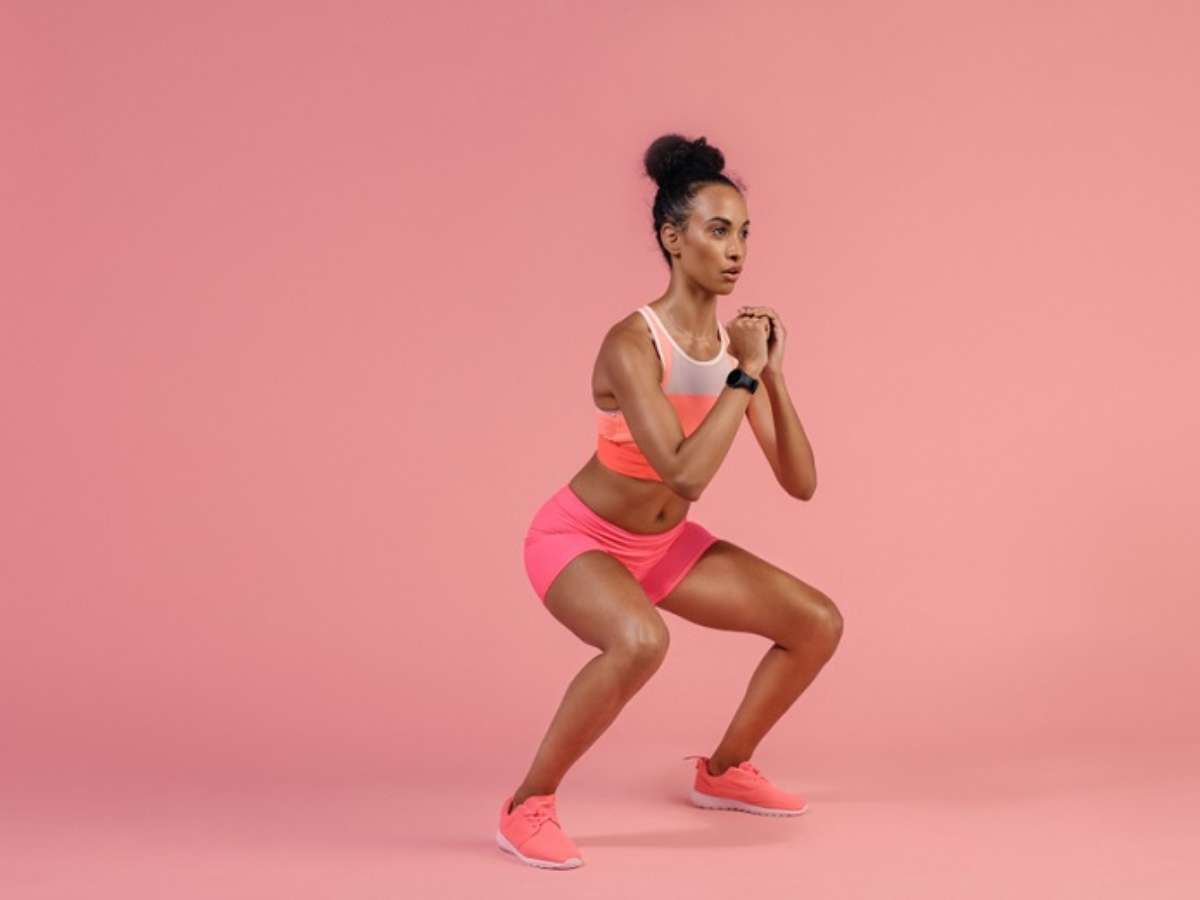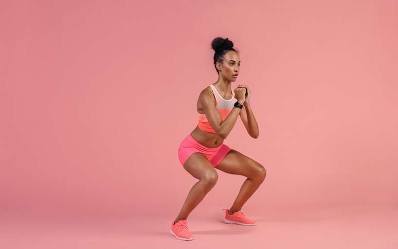 Agachamento: com as mãos na cintura e as pernas alinhadas com o quadril, flexione os joelhos até formar um ângulo de 90 graus. A posição correta é como se você fosse sentar em uma cadeira. Faça quatro séries de 25 repetições cada uma.
