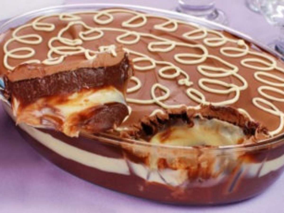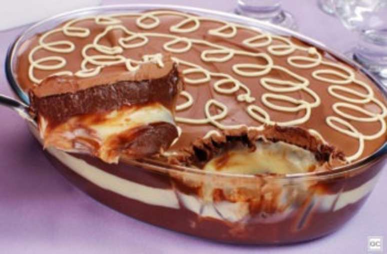 - Para a cobertura, derreta o chocolate ao leite em banho-maria e espalhe sobre o creme escuro. Leve à geladeira por 2 horas ou até secar e formar uma casquinha. Derreta o chocolate branco e decore formando desenhos. Sirva.