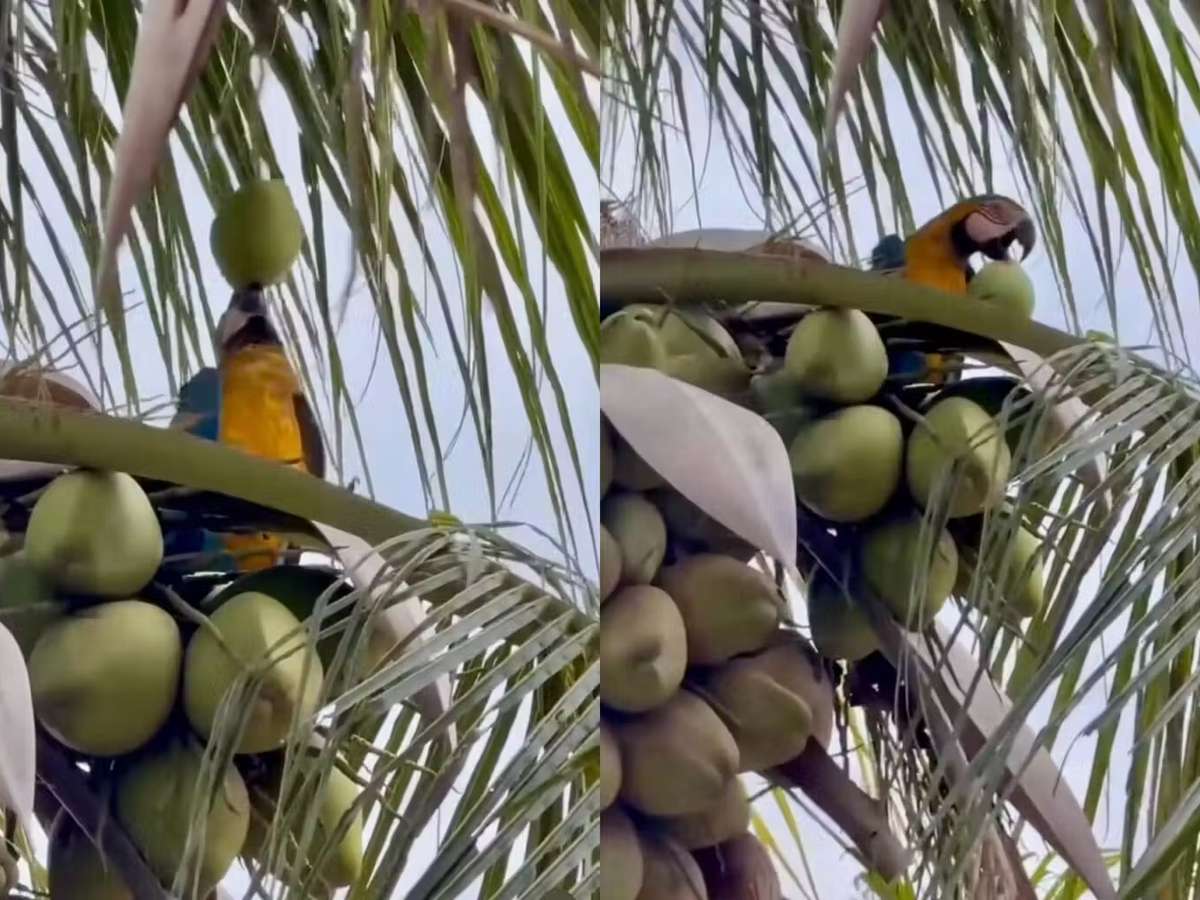 Um vídeo gravado em Cuiabá, Mato Grosso, mostra uma arara-canindé exibindo inteligência e graça ao beber água de coco no alto de um coqueiro. A cena encantou internautas e somou mais de meio milhão de visualizações em 48 horas no Instagram do “Só Notícia Boa”.