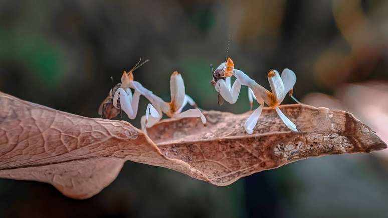 No caso do louva-a-deus-orquídea, o mimetismo não serve apenas como proteção. Ele também atua como uma estratégia de caça altamente eficiente. Posicionado imóvel sobre flores verdadeiras ou entre inflorescências coloridas, o inseto aguarda a aproximação de abelhas, moscas e outros pequenos polinizadores. Esses animais se atraem pelas cores vibrantes do conjunto. Ao enxergar a cena, muitas presas interpretam o animal como parte da planta e se aproximam sem cautela.