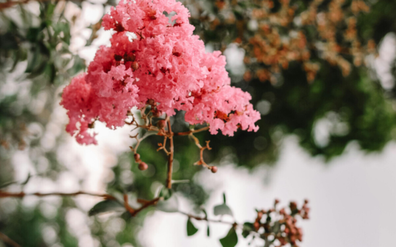 Suas flores são rosas ou violetas, dependendo da variedade, e suas folhas ovais são verdes no verão e avermelhadas no outono, criando uma cor deslumbrante na paisagem geral. A boa notícia é que a murta sobrevive em todos os climas (exceto os mais extremos), mas precisa de muita luz solar para crescer abundantemente.]