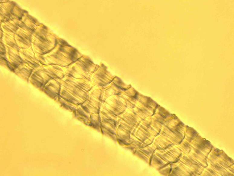 Fibra de lã sob um microscópio com as cutículas visíveis como escamas sobrepostas. snap the reel/Shutterstock