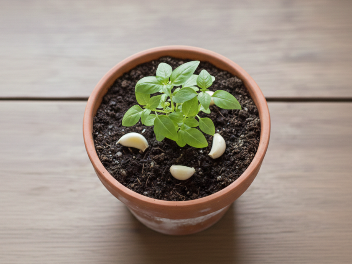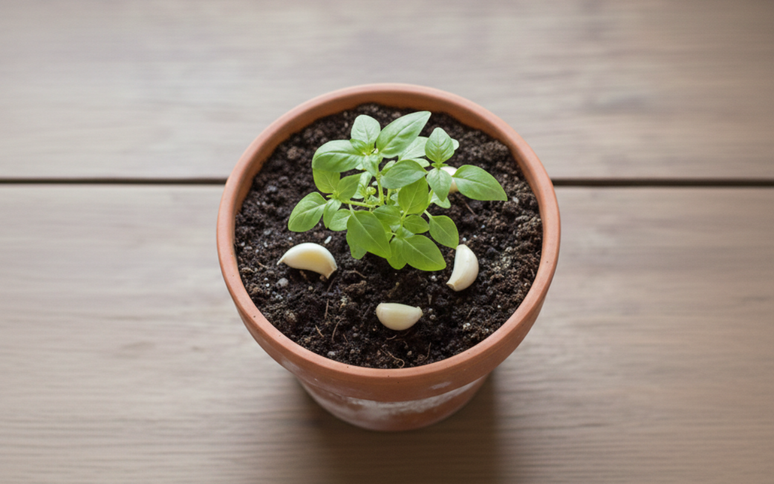 O alho é rico em compostos sulfurados responsáveis por seu aroma intenso. Quando colocado no solo, ele libera essas substâncias aos poucos, criando um ambiente menos atrativo para pragas comuns do jardim.