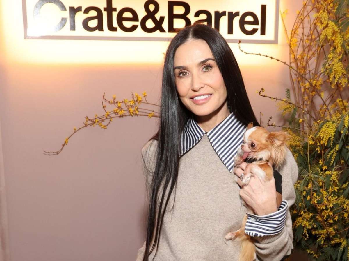 Demi Moore, uma das estrelas do filme "A Substância", esteve presente no evento da Crate & Barrel, de Brigette Romanek, em Los Angeles, marca conhecida por seus produtos para a casa.