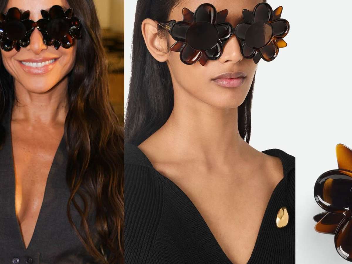 Sabrina Sato escolheu para combinar com seu look de alfaiataria o óculos de sol modelo Peggy Flower, da marca italiana Bottega Veneta. Entre os detalhes do acessório extravagante na cor havana/marrom, estão: armação em formato de flor 3D em poliamida e hastes com bordas suavemente arredondadas que lembram um caule de flor.