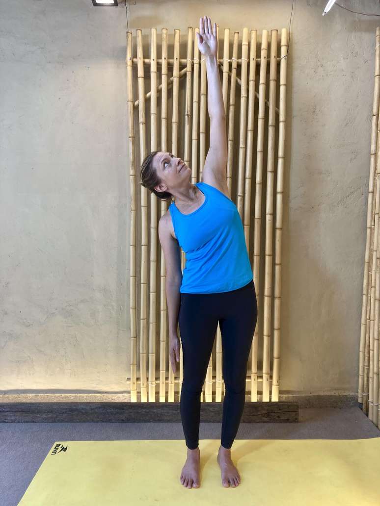 "Pada" significa pé e "Hasta" significa mão em sânscrito. Comece levando a mão esquerda na direção do pé esquerdo e a mão direita na direção do teto. Permaneça por sete respirações longas ou por 30 segundos em cada uma das posturas.