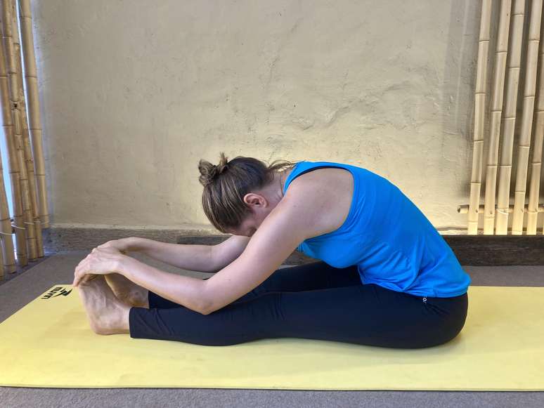 E por último, leve as mãos na direção dos pés e abrace as penas. Repita esta série, quatro vezes.