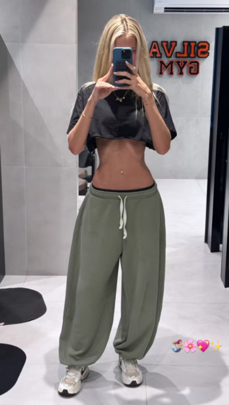 Yasmin Brunet, de 37 anos, publicou um registro direto da academia. Na imagem, ela aparece usando cropped e mostrando o abdômen definido. O detalhe das costelas aparentes também chamou atenção e evidenciou a transformação física.