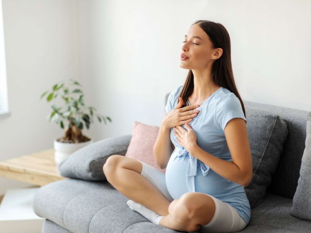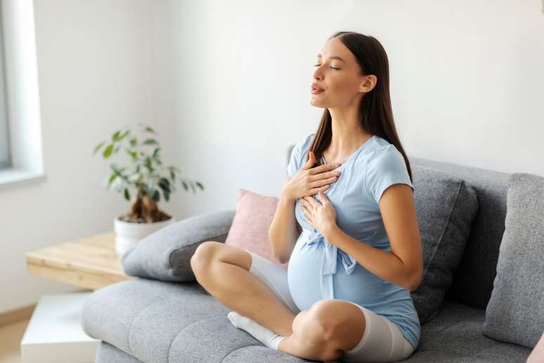 "Para praticar respiração profunda, a gestante pode se sentar confortavelmente, apoiar as mãos na barriga e inspirar lentamente pelo nariz, expandindo o abdômen, e expirar devagar pela boca. Repetir o ciclo por alguns minutos ajuda a acalmar a mente e reduzir a ansiedade", orienta Lidiane Garbim.