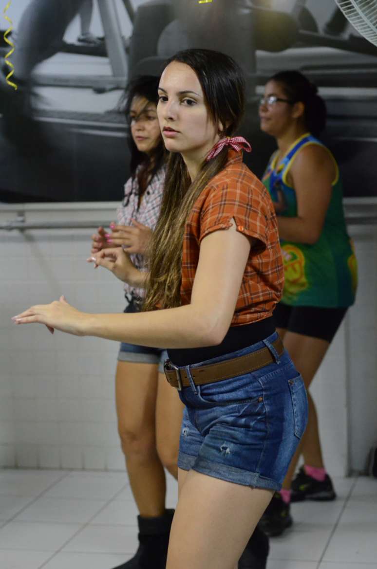 As aulas combinam os nada esportivos trajes juninos com outros instrumentos mais comuns às academias, como os bastões