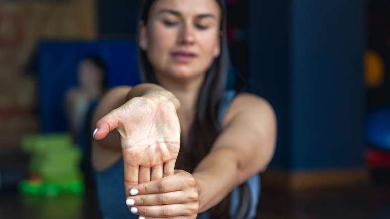 Sentada, estenda um braço à frente com a palma voltada para fora. Com a outra mão, puxe delicadamente os dedos para trás, alongando o antebraço.