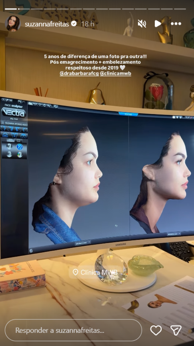 Nas redes sociais, Suzanna Freitas compartilhou imagens de antes e depois que mostram a evolução do rosto ao longo de seis anos.