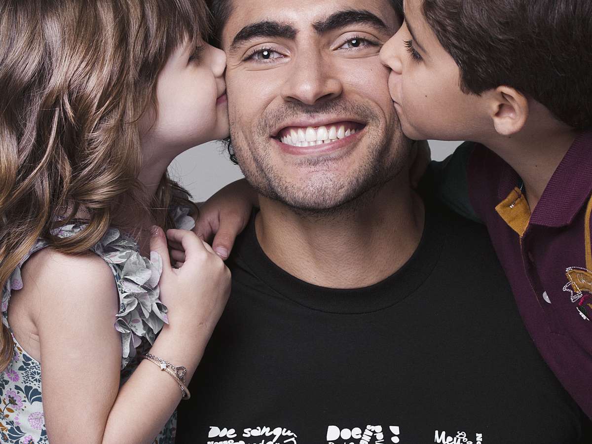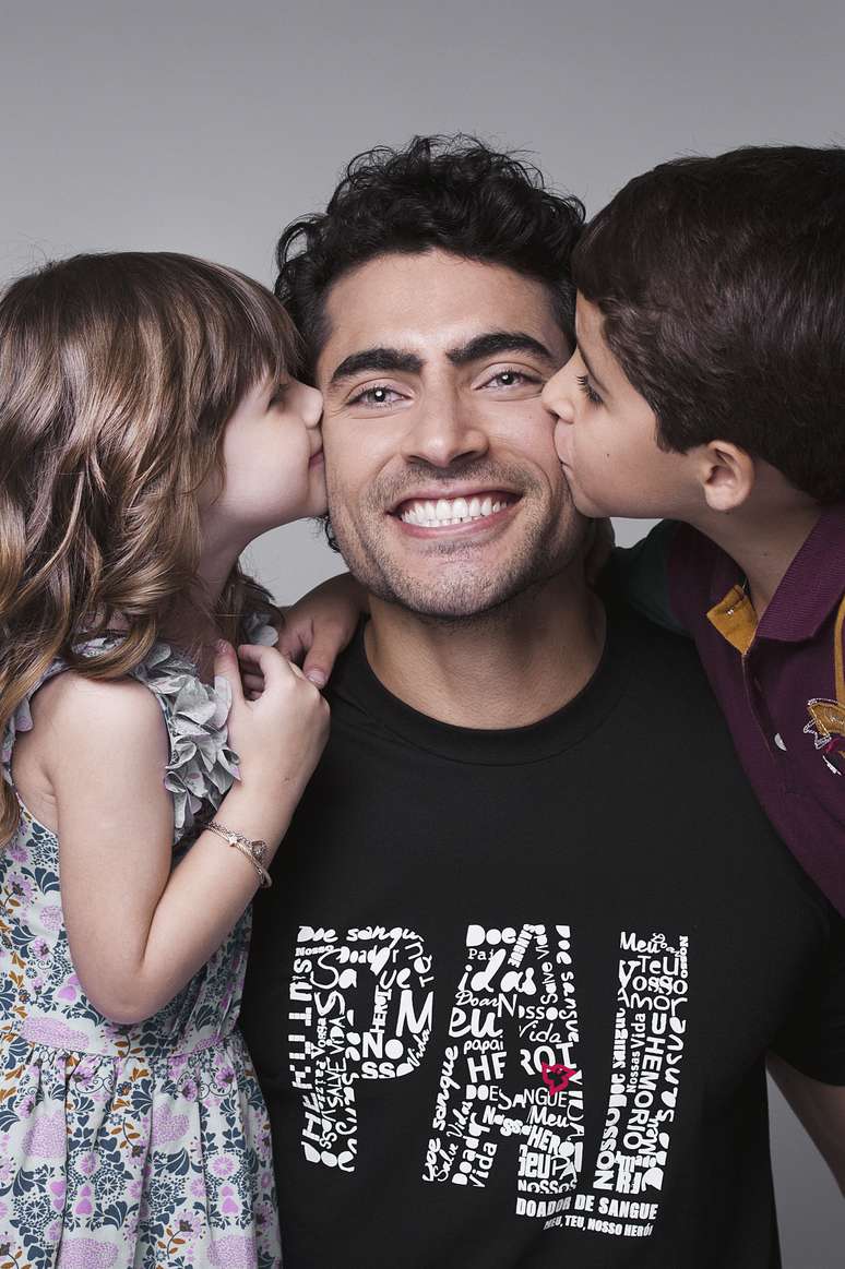 Para campanha de Dia dos Pais, Carlos Porto (centro) e Luiz Felipe Mello (dir.) posaram como pai e filho. A capanha incentiva a doação de sangue de um hemocentro