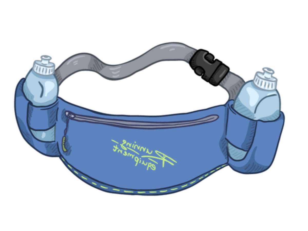 Feito de materiais como borracha e nylon, o cinto de hidratação oferece suporte para as garrafinhas de água. Além disso, possuem espaço para outros pequenos itens como chaves, carteira e celular. O corredor pode escolher quantas garrafinhas levará para o treino. Os fechos geralmente são de velcro, fivela ou faixa elástica, moldando-se ao corpo do atleta.