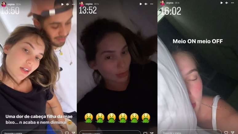Virginia Fonseca, esposa de Zé Felipe, voltou a reclamar de crises de enxaqueca em seu Instagram. A influenciadora já havia sido internada por alguns dias em maio deste ano por conta da cefaleia refratária. Grávida da segunda filha, Virginia revelou estar sentindo enjôo por conta das dores de cabeça.