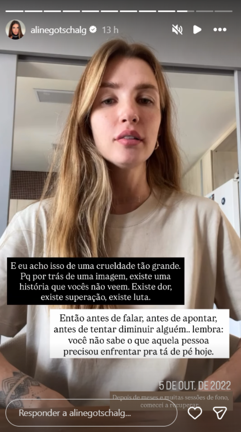 Recentemente, a influenciadora Aline Gotschalg voltou a falar sobre o tema após receber críticas nas redes sociais.