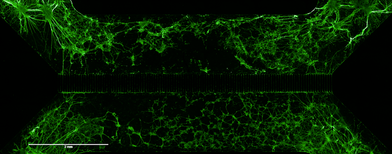 Imagem de culturas neuronais derivadas de células-tronco crescendo em um dispositivo microfluídico com dois compartimentos conectados por microcanais (400 μm). A superexpressão da proteína BDNF no compartimento inferior favorece o crescimento e a projeção de axônios a partir do compartimento oposto, mostrando o papel desse fator na integração e conectividade neuronal. Adaptado de IJMS.