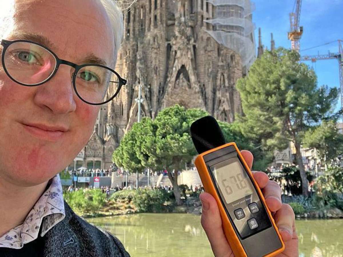 Natalie Mueller, do Institute for Global Health de Barcelona, me leva para uma caminhada pelo centro da cidade. Começamos em uma rua movimentada — meu medidor de som marca mais de 80 decibéis —, e seguimos para uma avenida tranquila e arborizada, onde o barulho cai para a casa dos 50 decibéis.