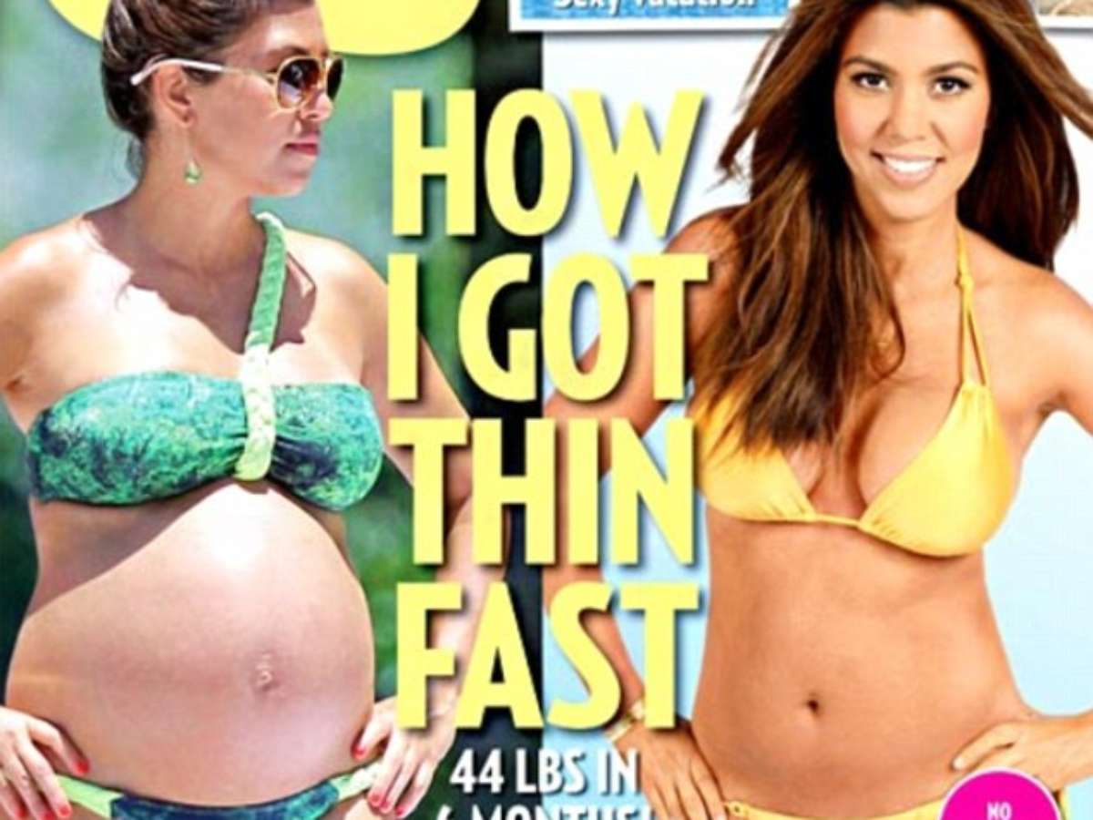 Seis meses após ter o segundo filho, Kourtney Kardashian exibiu o corpo em forma na capa da edição de dezembro da revista US Weekly, vestindo apenas um biquíni amarelo.