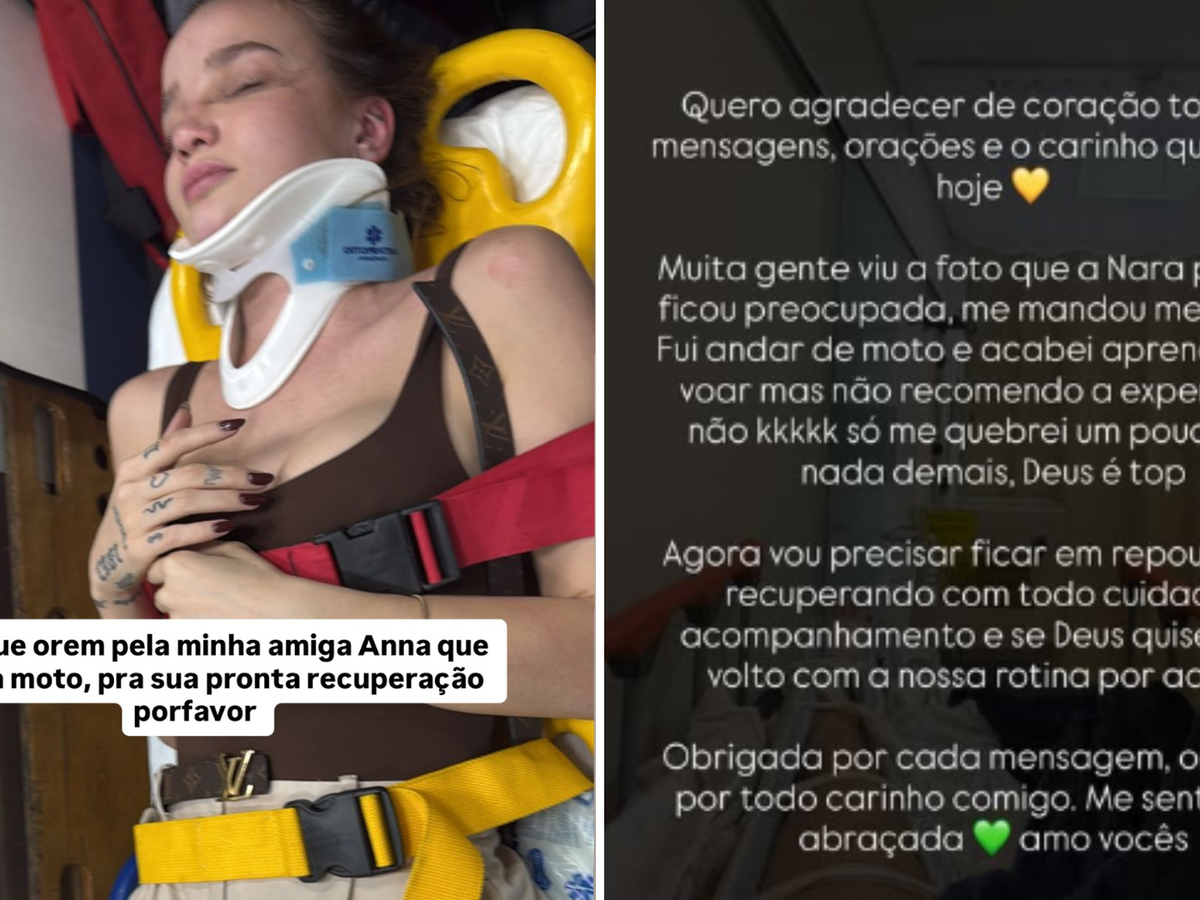 “Quero agradecer de coração todas as mensagens, orações e o carinho que recebi hoje. Muita gente viu a foto que a Nara postou e ficou preocupada, me mandou mensagem. Fui andar de moto e acabei aprendendo a voar, mas não recomendo a experiência não [risos] só me quebrei um pouquinho, nada demais, Deus é top”, conta Anna Livya em um post no Instagram, nesta quarta-feira, 25.