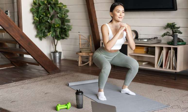O agachamento é um dos exercícios mais básicos, completos e eficientes que existem. Ele trabalha, predominantemente, a região frontal das coxas, mas também fortalece a lombar, o equilíbrio e aumenta o gasto calórico. Gabriele recomenda que, para a realização do exercício, a pessoa abra as pernas e afaste os pés paralelos à linha dos ombros. Depois disso, basta dobrar os joelhos, com a coluna reta e os glúteos para trás. O ideal é realizar três séries de 12 repetições.